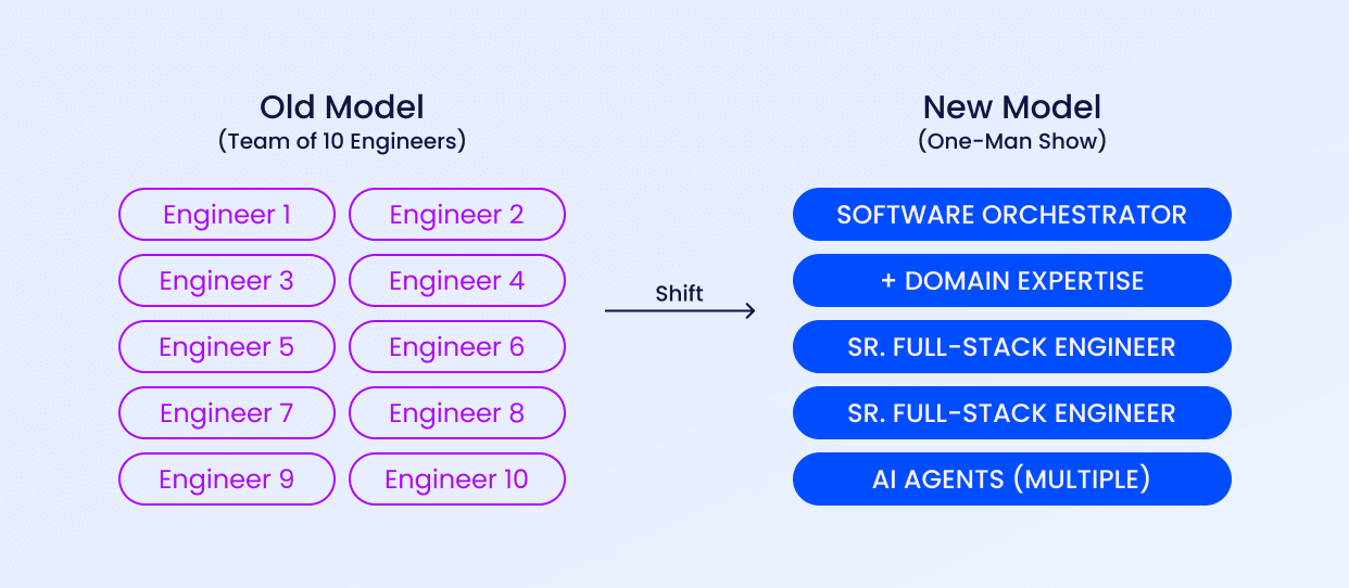 Instead of a team of ten engineers, we might end up with one orchestrator and two seniors running the entire show.